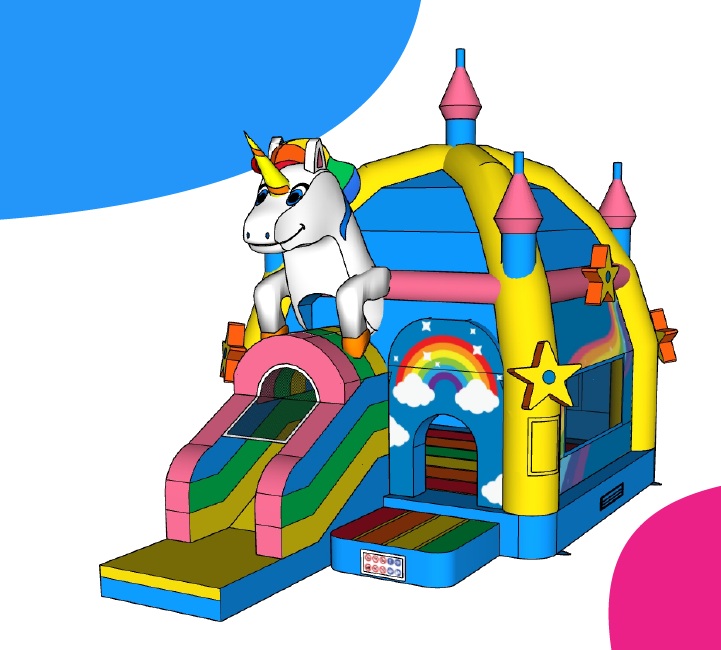 Mit der großen Einhorn-Hüpfburg wird jede Veranstaltung zu einem märchenhaften Erlebnis. Das liebevoll gestaltete Design mit einem großen Einhorn, bunten Regenbögen, funkelnden Sternen und einem zauberhaften Schloss lässt Kinder sofort in eine fantasievolle Märchenwelt eintauchen.